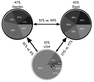 Respondents were presented with the three pair-wise combinations of these pie charts (in random order) and asked them to choose which nation they would rather join. A large nationally representative sample of Americans seems to prefer to live in a country more like Sweden than like the United States.
