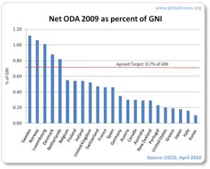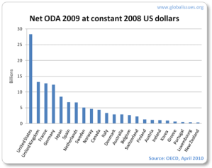 Looking at the U.S. government’s foreign aid in 2009, you see that it approached 30 billion dollars, more than double the totals of the next closest nations. However, if you look at the sums as a percentage of Gross National Income, the graph tells a quite different story.
