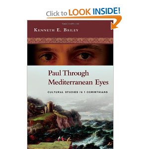 I just finished reading Kenneth Bailey’s Paul Through Mediterranean Eyes. I have loved reading Bailey’s other works on the parables of Jesus and, especially, the Prodigal Son. In the book Bailey takes up Paul’s first epistle to the Corinthians. The strength of Bailey’s reflections on Paul is his analysis of Paul’s rhetoric. His identification of Paul’s use of chiasms and Paul’s appeal to Isaiah and Amos enlightens and clarifies anyone’s reading of 1 Corinthians. Although Bailey’s commentary isn’t as quite as informative (he primarily follows Thiselton and Fee), his autobiographical asides from experiences in the Middle East are jewels hidden throughout the text for the reader to discover and to sense the power of Paul’s letter for contemporary disciples in the Mediterranean and beyond.